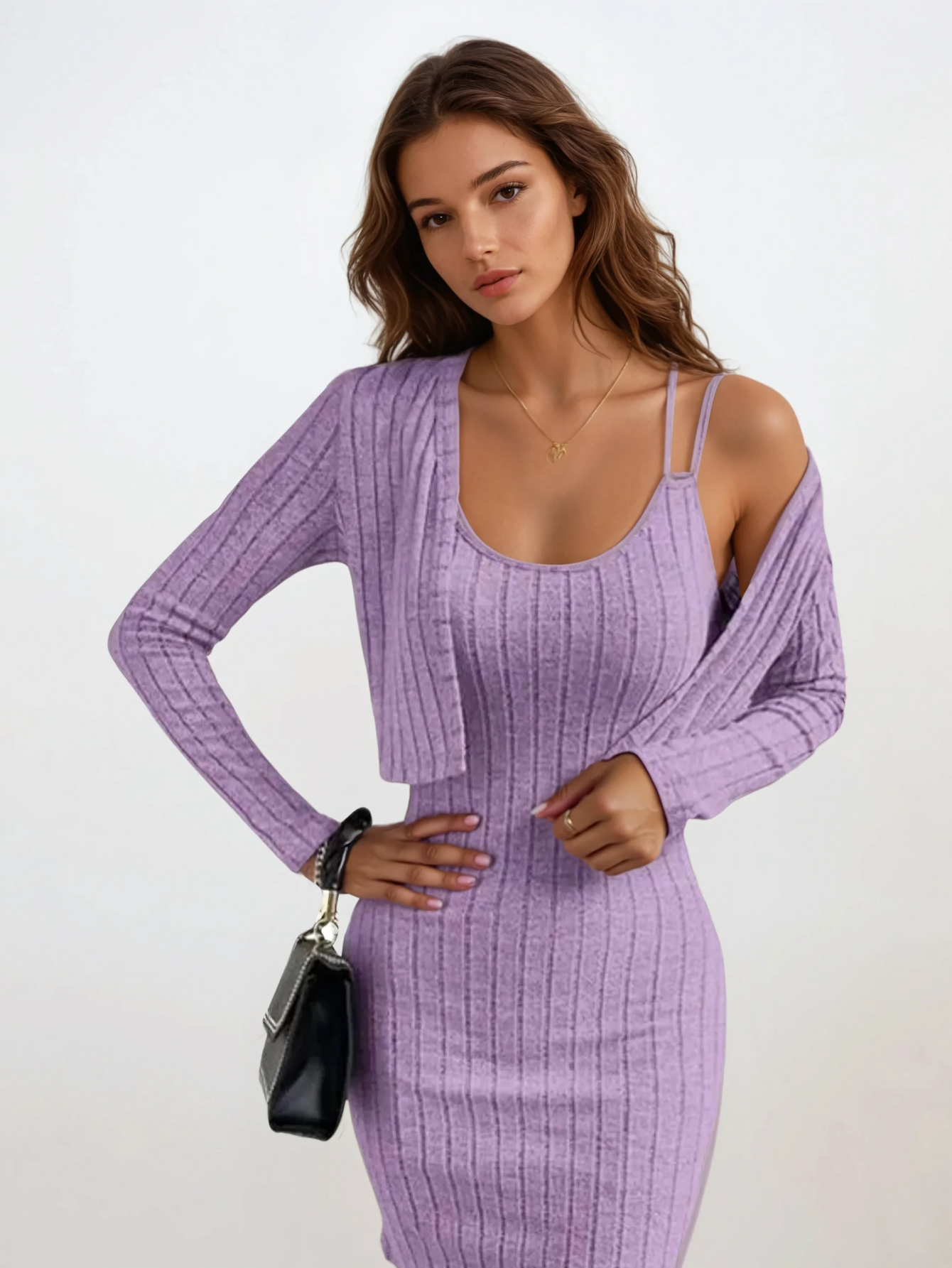 Mit Dawn of Harmony erhebst du Mode zu einer Kunstform. Dieses exquisite Ensemble, bestehend aus einem körperbetonten Strickkleid und einem zarten Cardigan - wurde geschaffen für Frauen mit Haltung, Stil und Anspruch.