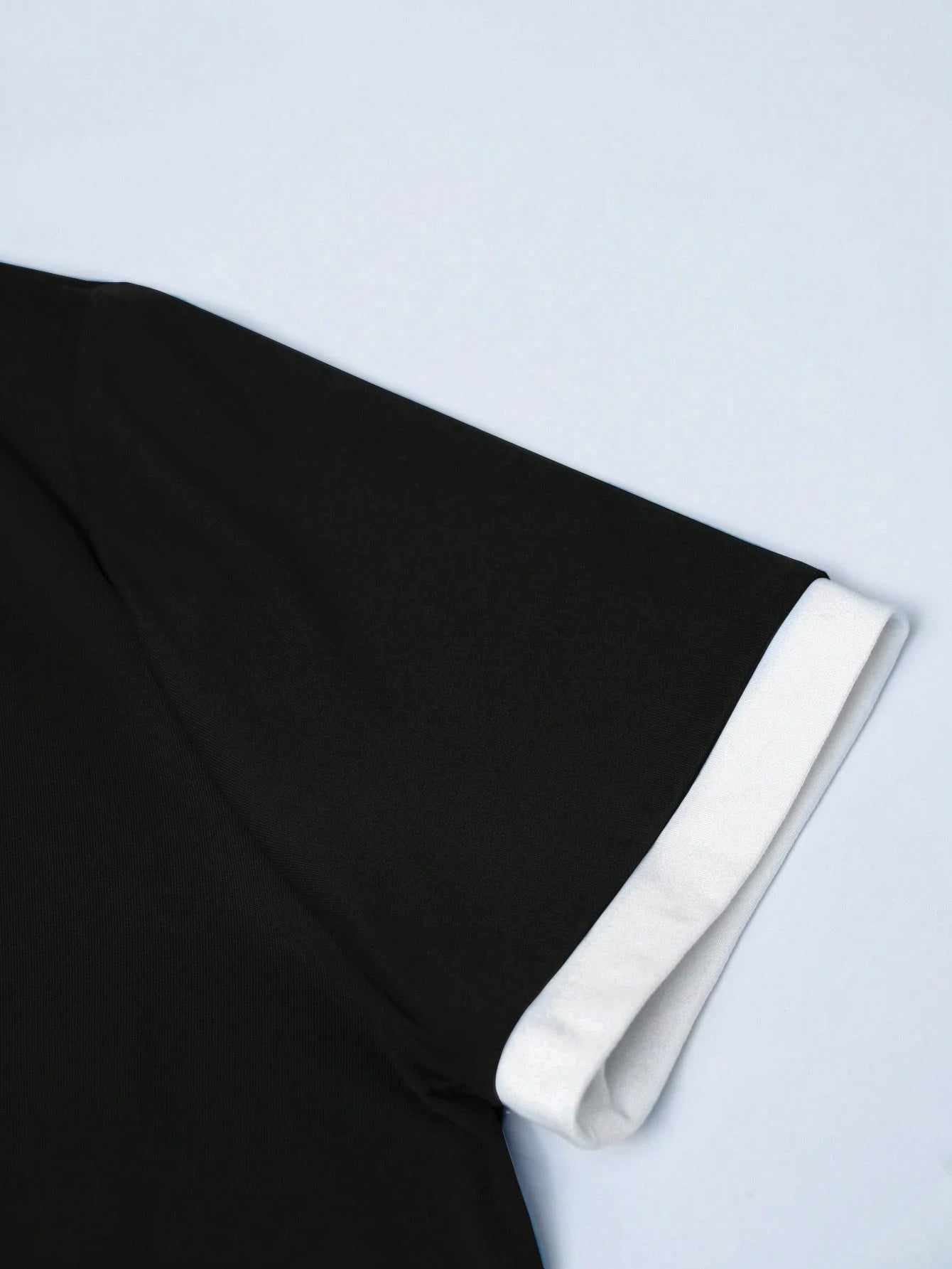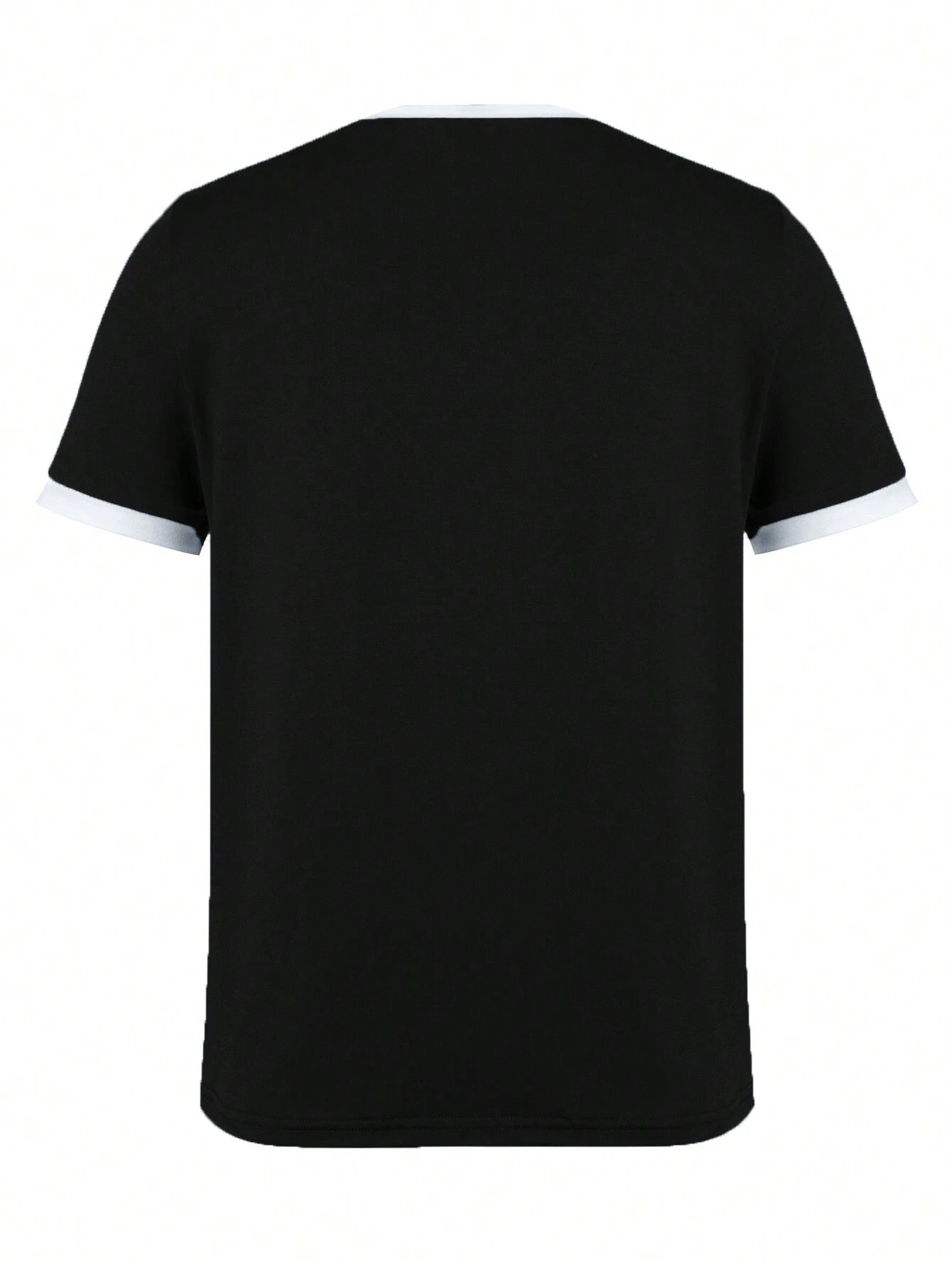 Dieses elegante schwarze T-Shirt vereint lässigen Komfort mit stilvollen Details. Der Rundkragen und die kurzen Ärmel in klassischem Design sorgen für eine entspannte Passform, während die kontrastierenden weißen Streifen an den Ärmeln, am Kragen und am Saum für einen modernen Farbblock-Look sorgen.